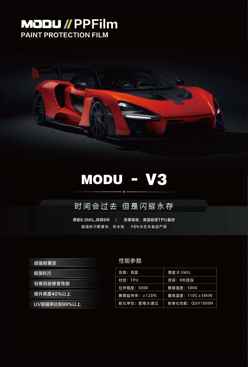 德国摩都MODU品牌车衣从基材到生产,从成品到测试,每一个环节都经过精心测试,为您的爱车保驾护航!,我们提供高端质量的漆面保护膜(PPF)和最全面的电脑裁切数据库,确保客户得到良好的体验。